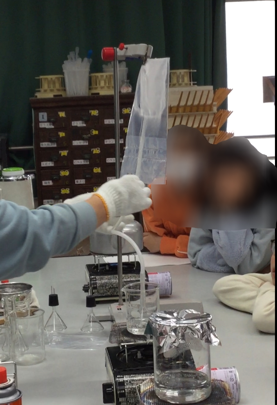 実験後も、一部の児童は、沸騰した泡の正体は空気である、と考える。エアポンプの実験と比較して、空気を集めた場合は、時間が経っても袋がしぼまないことを確認するとよい。