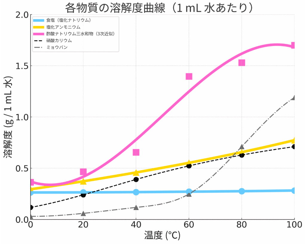 - 水1mLに次の4つの物質が溶ける量は以下のグラフのとおりです。(※酢酸ナトリウム三水和物の溶解度はSeidel et al,Solubilities of Inorganic and Organic Compounds, p.626(1952)より、他は理科年表より算出)